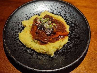 Steak z hovězí roštěné s pečenými brambory, žampiónovým ragú, bylinkami a smaženou cibulkou