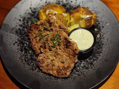 150g STEAK Z VEPŘOVÉ KRKOVICE brambory Grenaille a omáčka z pečené cibulky, slaniny a smetany
