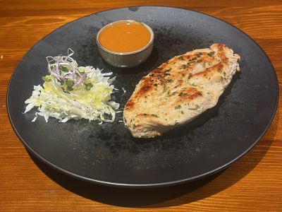 200g Kuřecí špíz pečený v pikantní medovo jogurtové marinádě na pečené rýži se sekaným baby špenátem a pestrou zeleninovou oblohou ze strouhané mrkve, strouhané červené řepy, sekaným salátem, smetanovo bylinkový dresink + nápoj 67910
