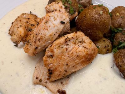 150g Kuřecí steak, rokfórová smetanová omáčka, pečené kořeněné mini brambůrky ve slupce 1a7