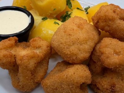 150g Kuřecí řízečky v sýrovém těstíčku, bramborová kaše, salátek Coleslaw A-1, 3, 7