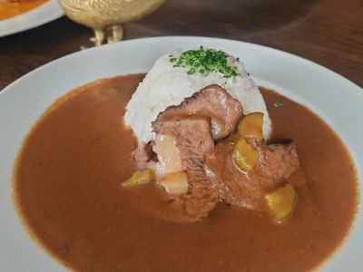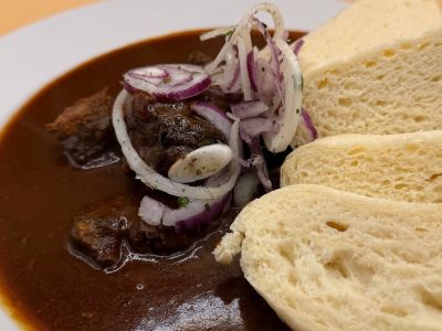 Hovězí guláš, houskový knedlík a červenou cibulkou