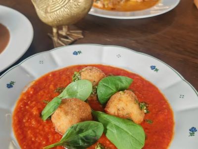 Arancini s pancettou a hřiby, s parmezánovou omáčkou s dijonskou hořčicí a bylinkami 13710