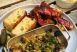 Platter 2: Uzené krůtí stehno s bylinkovým máslem s česnekem, focaccia, zakysaná smetana, meruňková BBQ, gouda sandwich, nachos, kyselý salát, nakládaná cibule