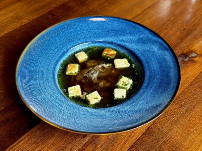 Polévka 3: Naše kulajda s hříbky a bramborami, podávaná s pošírovaným vejcem