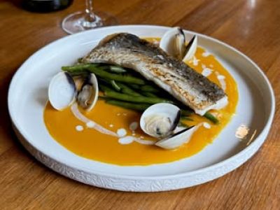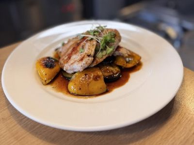Vepřový tomahawk na uhlí, petržel, karotka, marsala, hořčice, jus –