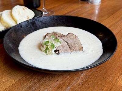 MENU 1: Křenová omáčka s uzeným masem, houskový knedlík