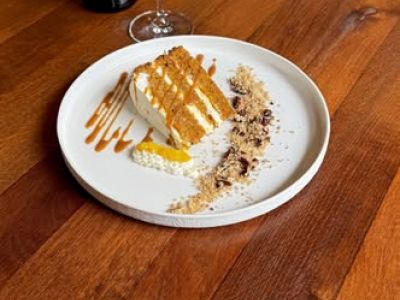 Dezert: Meruňkový upside-down karamel frangipane koláč, uzené mandle, smažené filo, mascarpone zmrzlina