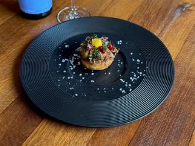 Tartar z telecí svíčkové, medvědí česnek, cuketa, šalotka, citronová majonéza, bruschetta –