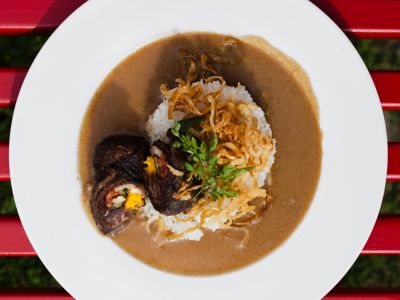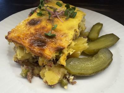 150g Naše vepřová sekaná plněná olivami a italskou pancettou podávaná s máslovou bramborovou kaší a nakládanou zeleninou