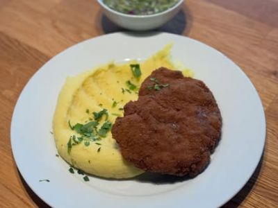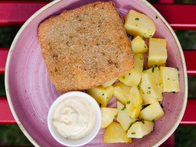 150g Cordon bleu plněný vepřovou šunkou a sýrem podávaný s mačkanými brambory s máslem a jarní cibulkou, domácí tatarka, výhonky