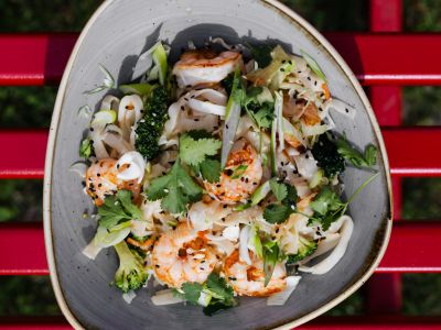 Grilované krevety, linguine aglio olio, chřest, citron –