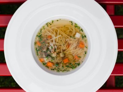 Polévka 2: Silný kuřecí vývar s masem a nudlemi