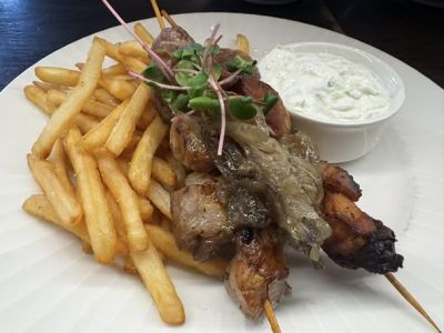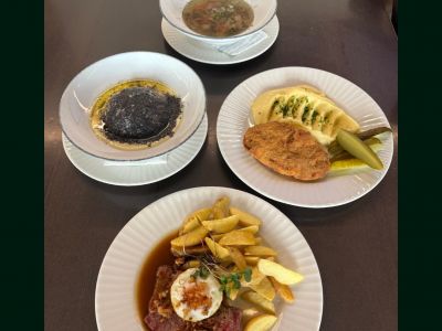 4) Grilovaný steak z vepřové kotletky, zelené fazolky na slanině, pečené brambory s česnekem a dresink (1,3,6,7,9,10) 140g