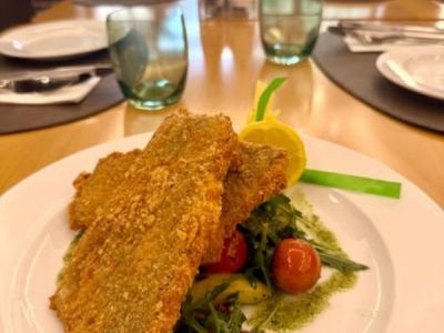 2) Kuřecí Cordon Bleu plněný šunkou a sýrem, bramborová kaše, výhonky ředkvičky (1,3,6,7,9,12) 120g