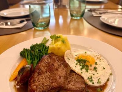 Steak z vepřové kotlety, sázené vejce, pečené fazolky smažené hranolky