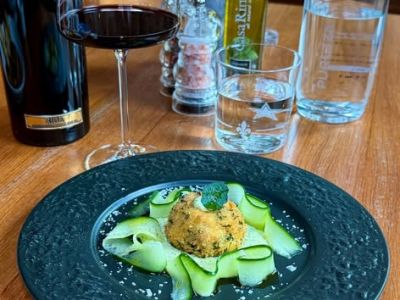 Grilovaný kozí sýr, medovo-pomerančová zálivka, salát, granátové jablko, olivy