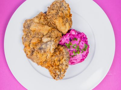 Holandský řízek, bramborová kaše, okurek