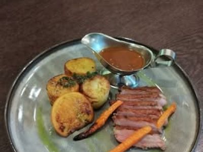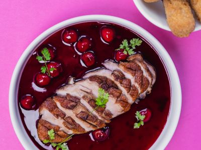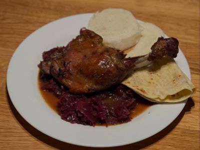 Francouzská kachní roláda, dušené červené zelí, houskový a špekový knedlík 137
