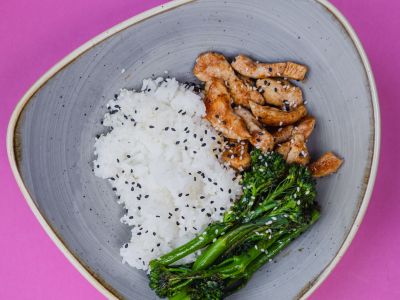 🔸Sweet chilli kuřecí stehno, pečené stehno v marinádě ze sweetchilli, limetky, sójové omáčky a zázvoru, jasmínová rýže, zelno-mrkovový salát s mátou a sezamem