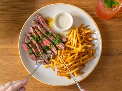 Vepřový steak na medu, zakysaná smetana, americké brambory