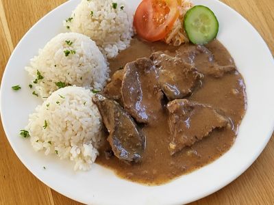 Hovězí vídeňský guláš, zdobený cibulí, houskový knedlík 137