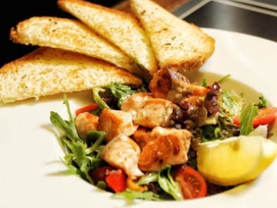 Ceasar salát – řecký salát s ančovičkovým dipem, kuřecí kousky, cherry rajčaty a opečenými žemlovými krutóny