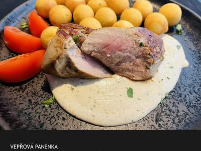 Grilovaná vepřová panenka, grilovaná zelenina, bramborové dukátky 137