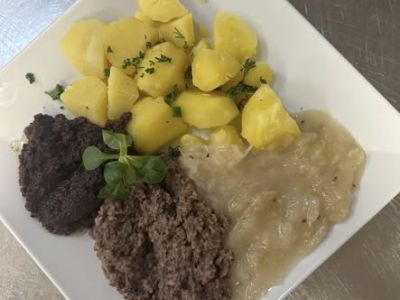 1 ks Hamburger z divočáka, cibulové chutney, anglická slanina, zelenina, sázené vejce, bramborové dukátky (1, 3, 7) 137