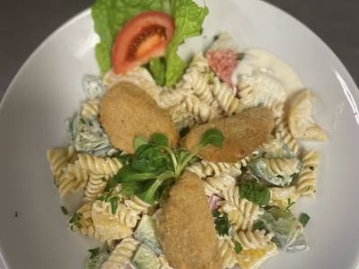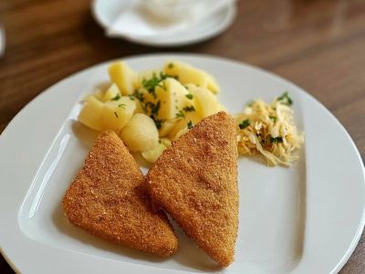 150g Smažený sýrovo-šunkový špíz, vařené brambory, tatarská omáčka 71.13610