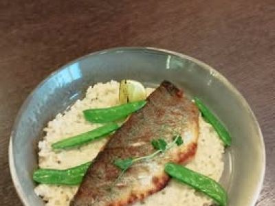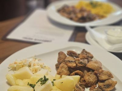 🔸Smažená treska, vařené brambory s máslem a pažitkou, mačkaný hrášek s lanýžem, tatarka s koprem a kapary, citron