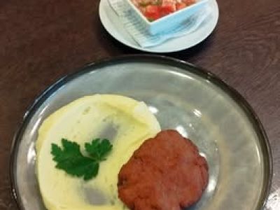 Karbanátek, bramborová kaše, sterilovaný okurek 312