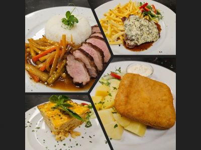 150g Vepřová kotleta na tymiánu s hráškem, vařené brambory (1, 3, 7) 137