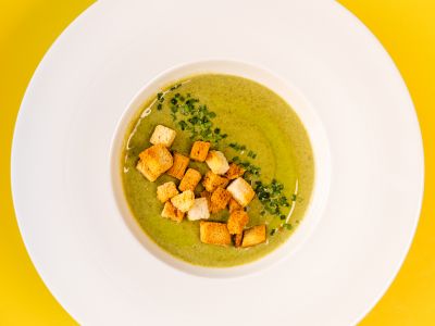 Konfitované baby kuře, mrkvové pyré, hrášek, chřest, nádivka s uzeným a medvědím česnekem