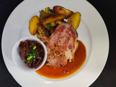 Pečená vepřová plec na černém Budvaru, bramborová kaše