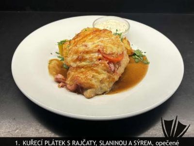 Zapečený kuřecí steak s hermelínem, dollar chips