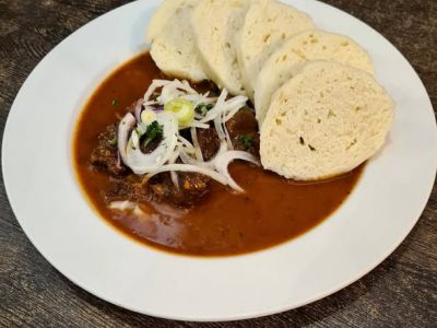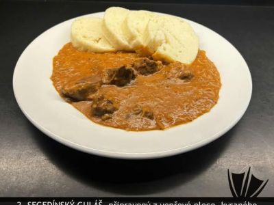 100 g Segedínský gulaš (1, 7), houskový kn 17