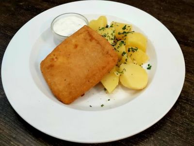 Smažený sýr Gouda 48% plněný šunkou, domácí tatarská omáčka, vařené pažitkové brambory