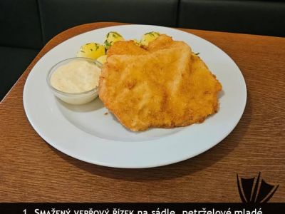 150g Vepřový plátek v hořčicové omáčce, opékané brambory /rýže/