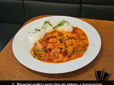 TÝDENNÍ OBĚDOVÁ SPECIÁLKA: Kuřecí nudličky s nivou, houbami, pórkem a smetanou, Basmati rýže / hranolky