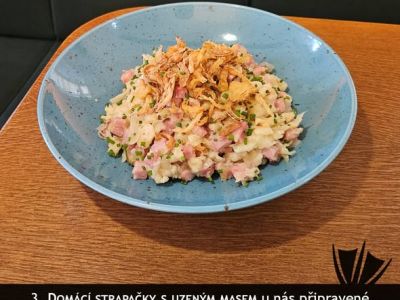 ŠPECLE s uzenou krkovicí pečenou na sádle a kysaným zelím se smaženou cibulkou