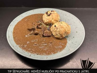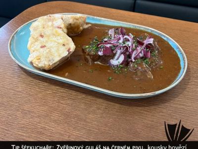 Dušená hovězí loupaná plec s houbovou omáčkou a houskovým knedlíkem 160, -