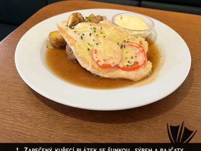 Přírodní plněná krůtí kapsa šunkou a nivou podlitá vlastní šťávou servírovaná s hranolky a tatarskou omáčkou 175, -