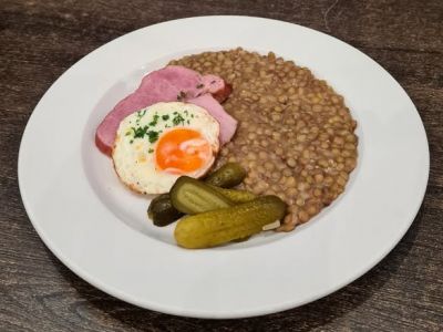 Menu : Hovězí vývar s masem, zeleninou a těstovinou - Zapečené těstoviny s vejci a uzenou kýtou restovanou na cibuli 180, -