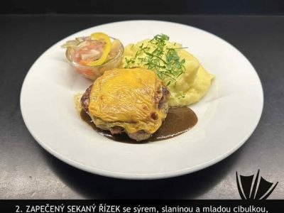 150g Smažený karbanátek se slaninou, okurkový salát, máslová bramborová kaše