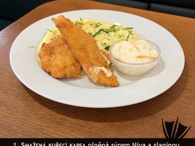 smažený kuřecí řízek, bramborová kaše, okurkový salát (1,3,7)