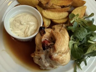 Bezlepkový pokrm: 150 Marinovaná vepřová kotleta na zeleninovém lůžku, 1/2 šťouchané brambory (3, 7, 9, 10)