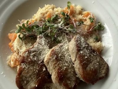 Kotleta sous-vide se zapečeným hermelínem, medovo-hořčičnou omáčkou a jasmínovou rýží 1710