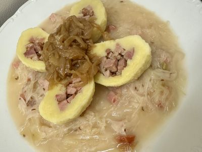 Bramborové knedlíky plněné uzeným masem, zelí 13