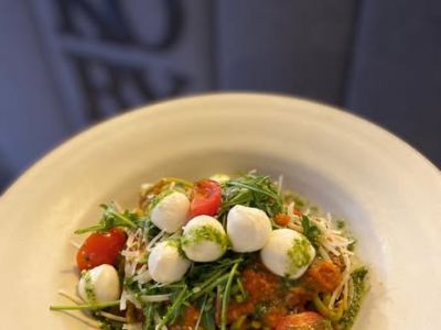Noky v houbové omáčce, medailonky z vepřové panenky, baby špenát VEGE varianta: mozzarella, třešinky